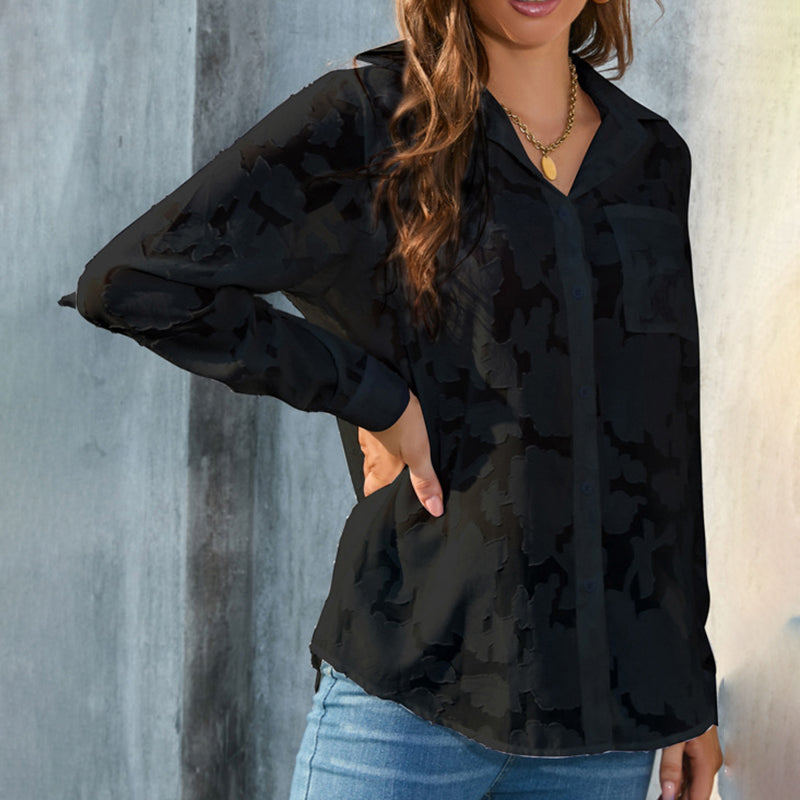 Womens Casual Sheer Button Down Shirts Long Sleeve V Neck Jacquard Blouses Tops